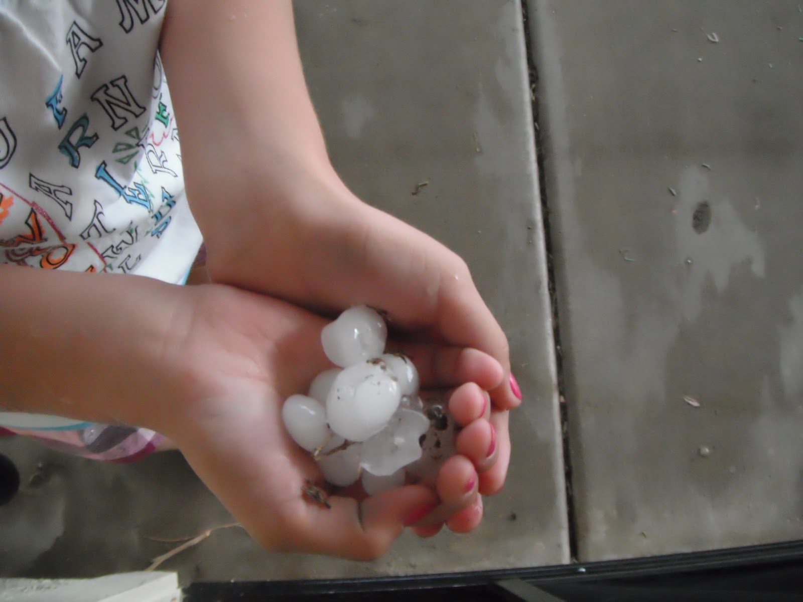 When you're born and raised in Arizona, little things like hail should seriously be celebrated. Since all 5 of us were, in fact, born and raised here (minus the 3 years we spent in Hawaii - another state with little to no hail....), today's hailstorm was an exciting event. It started this morning while Amber and Jade were at school. It was raining, the lightning took out the satellite, thus interupting David's Cold Case show, and then we noticed the rain was rather loud. After a little investigating, David came back inside and reported pellet-sized hail. Cool! When Amber and Jade got home, they told me how awesome the hail was and how their teacher's let them hang out under the porch just outside their classrooms to see it. Then, while getting dinner ready, all 3 girls were playing in the rain when I heard them all start screaming! It was mostly, "GET THE BABY! GRAB PAISLEY! RUUUUN!!!" Yeah, the hail started again. And instead of being little pellets, they were big ol' chunks of ice! When it finally stopped, all 3 girls went back outside to check out the ice balls piled in the yard. They thought it was pretty cool. Paisley kept eating them and after much reassurance that she wouldn't die from eating hail, Amber and Jade finally stopped yelling at her and trying to shove her into the house. What a fun day!
